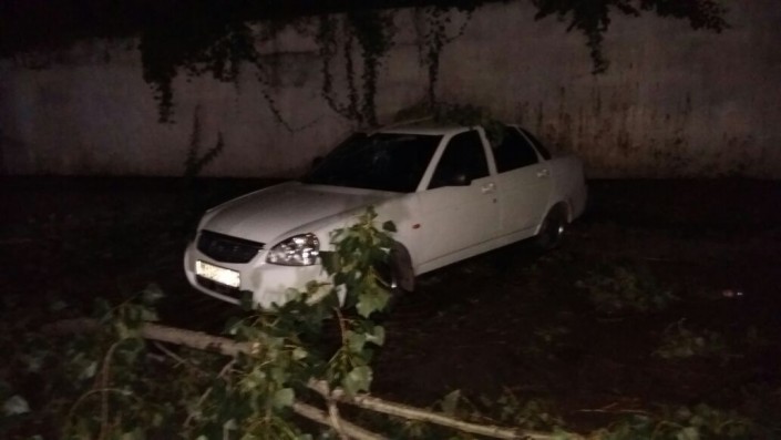 На припаркованный на стоянке парка "Коктобе" автомобиль Lada Priora упали ветки дуба. На Daewoo Nexia упал ствол сломавшейся ели. Пострадал и стоявший по улице Омарова погрузчик. На него упала береза. Сообщается, что в результате инцидента люди не пострадали.