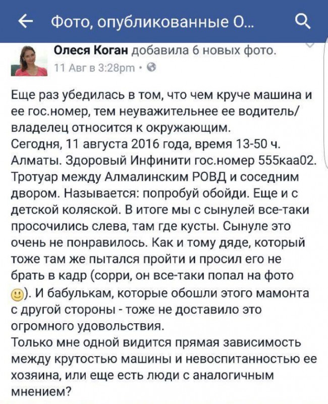 "Как только об этом факте стало известно, в отделе розыска местной полицейской службы приступили к проверочным мероприятиям. Владелец автомашины марки Infiniti, что фигурировала в сигнальном материале, был установлен сразу же. Это гражданка Д., местная жительница. Женщина сразу же признала факт нарушения, о чем сделала соответствующую отметку в административном протоколе, составленном сотрудниками дорожно-патрульной полиции по признакам правонарушения, что предусмотрено частью 3 статьи 597 КРКобАП "Нарушение правил остановки, повлекшее создание препятствий для движения". Данной нормой предусмотрен административный штраф в размере 20 МРП. Отметим, что данный факт имел место днем 11 августа во дворе 111-го дома по улице Карасай батыра в Алмалинском районе города", - прокомментировал инцидент заместитель начальника ДВД Алматы полковник полиции Избасар Бектуров.