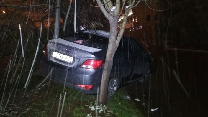 В Алматы водитель на Hyundai застрял между деревом и столбом Фото "Территория происшествий"©