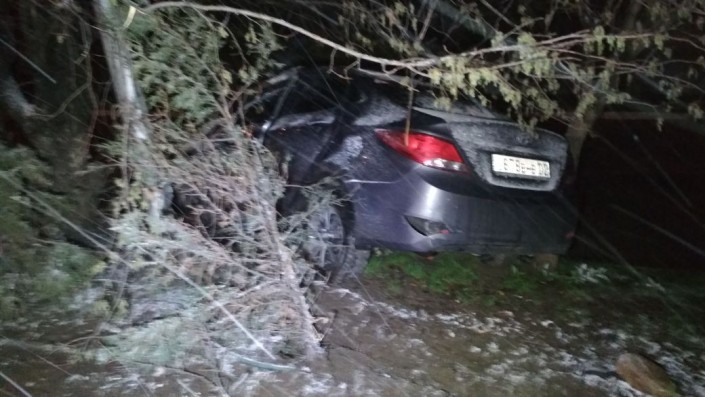 В Алматы водитель Hyundai из-за плохих погодных условий вылетел с дороги. В результате этого его машина застряла между деревом и столбом, передает корреспондент программы "Территория происшествий" на телеканале СТВ.