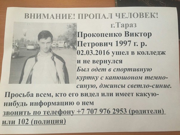 В Таразе вот уже неделю ведутся поиски студента третьего курса политехнического колледжа Виктора Прокопенко, 1997 года рождения. Объявления о розыске парня расклеены по городу, а также появились в социальных сетях.