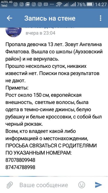 Также в соцсетях размещено объявление о розыске девочки. Жителей города просят обращаться с информацией по телефонам 8-707-8809948 и 8-747-4788998.