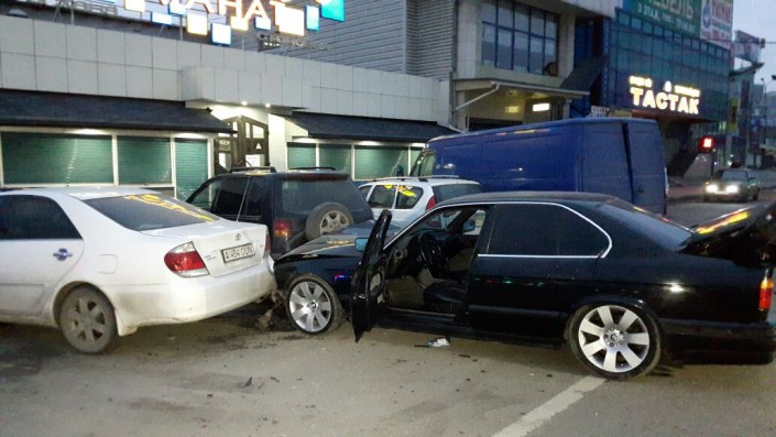 Инцидент произошел на пересечении улиц Толе би и Брусиловского. По словам очевидцев, водитель за рулем BMW потерял управление и вылетел на парковку, в результате чего задел несколько машин. Повреждения получили четыре автомобиля. В результате ДТП никто не пострадал. Как сообщили очевидцы, водитель якобы находился в состоянии алкогольного опьянения.