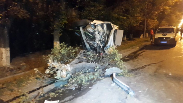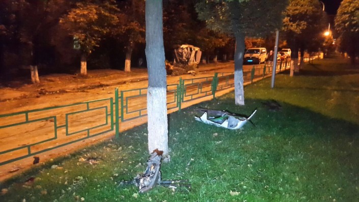 По словам очевидцев, водитель авто не справился с управлением. В результате Lexus перелетел через разделительный газон, сбил два дерева и перевернулся на бок.