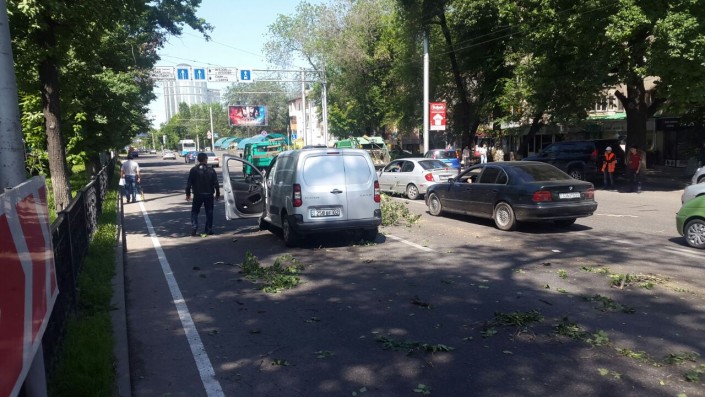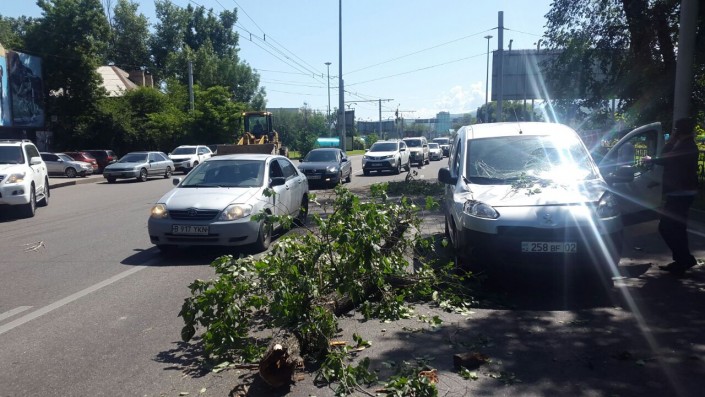 Инцидент произошел на проспекте Абая, не доезжая до улицы Манаса. Водитель Peugeot двигался в западном направлении по Абая, когда на авто упало дерево, повредив лобовое стекло и капот. Водитель автомобиля был госпитализирован.