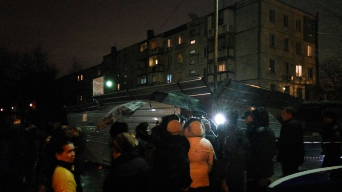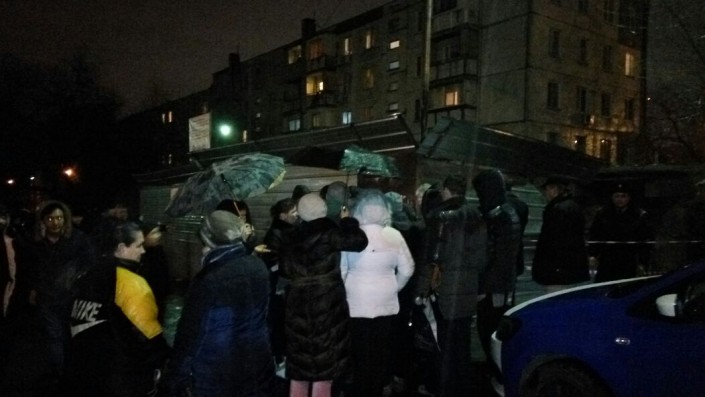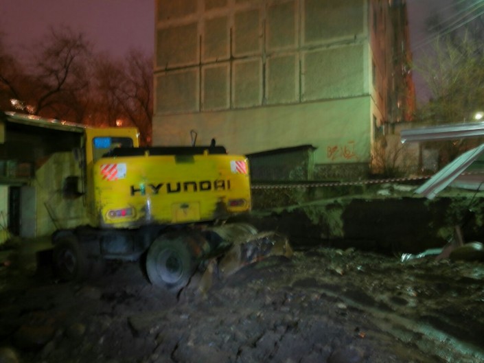 По словам жильцов дома, рядом с существующим зданием, где ранее якобы был прием стеклотары, начала производить пристройку одна предпринимательница, и сегодня вырыли котлован. В результате дождя к вечеру он начал обваливаться. В связи с этим около 40 жильцов вышли на улицу, они опасаются, что обвал грунта повлечет обрушение дома. "Тут страшно находиться, слышен грохот обваливающегося грунта. А рядом наш дом, страшно спать сегодня. Здесь и трех метров нет до жилого дома, а такая яма", - жалуются жильцы.