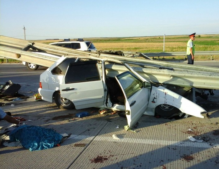 "Водитель автомобиля ВАЗ 2114, ехавший из Туркестана в Шымкент, не справился с управлением и на большой скорости протаранил дорожное ограждение, разделяющее автополосы. Ваз налетел на ограждение, и стальной барьер прошил российский автомобиль насквозь, разрушив моторный отсек и вырвав крышку багажника", - сообщает телеканал.