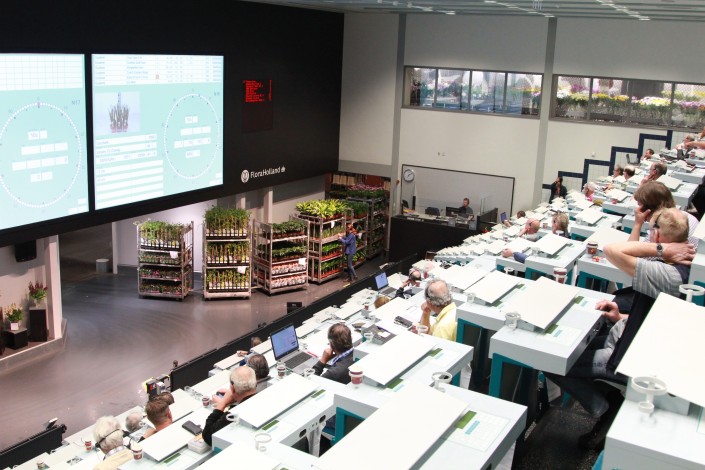 Работа здесь начинается в 5 утра. Садовники завозят свои цветы и выставляют их на аукционе. Брокеры от различных компаний, присутствующие на трибунах или работающие онлайн, пытаются купить растения по наименьшей цене. Основная идея этого аукциона в том, что здесь цену на цветы диктует рынок, а не садовники. К примеру, к празднику 8 Марта цена на хризантему может доходить до 1,5 евро, а летом спускаться до 10 центов.