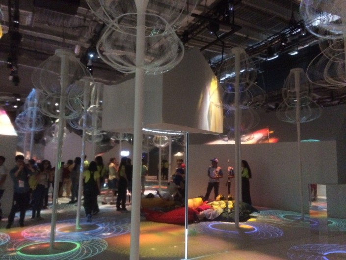 Так выглядит павильон, наполненный людьми. Столбы энергии раскручивают свои механизмы, весь пол освещается яркими узорами