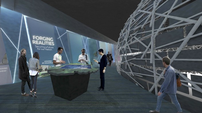 В общей платформе гости смогут отдохнуть, эту зону организаторы выделили "для размышления". На данном участке будут также представлены снимки сингапурских компаний и вращающиеся экспонаты.