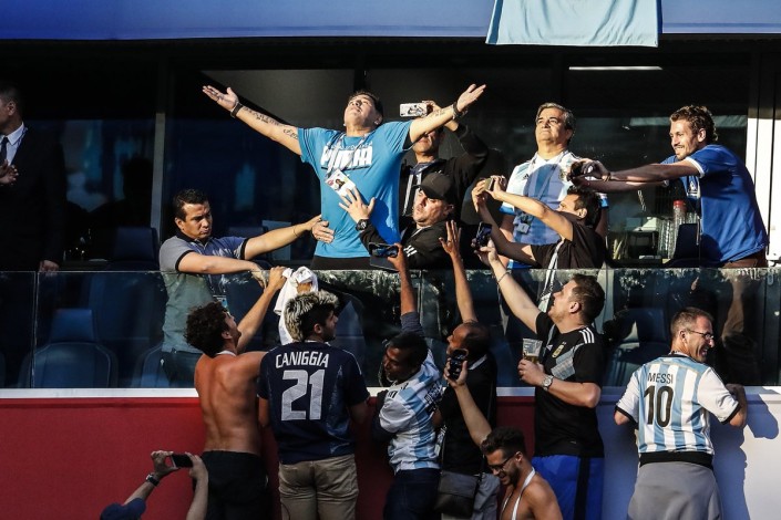 Марадона наблюдал за матчем из VIP-ложи, и во время телетрансляции камеры неоднократно показывали его бурные эмоции и реакцию на происходящее. Футболист вел себя вызывающе и порой неадекватно. Перед игрой Марадона станцевал с болельщицей сборной Нигерии. А после второго гола аргентинцев показал неприличный жест.