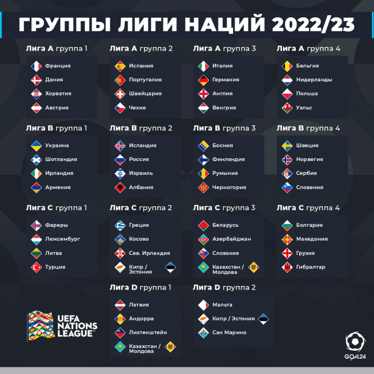 Лига наций стартует в июне 2022 года. Ниже представлены итоги жеребьевки всех групп турнира.