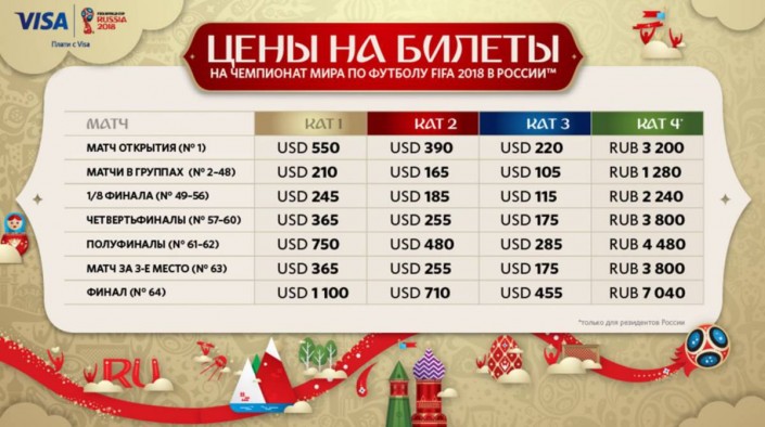 Независимо от матча и стадиона существует четыре категории билетов. Их главное различие - это цена. Самая дешевая категория - четвертая. Она доступна только для резидентов России (граждане РФ и лица, постоянно проживающие там). Иностранцам на выбор предложено только три категории.