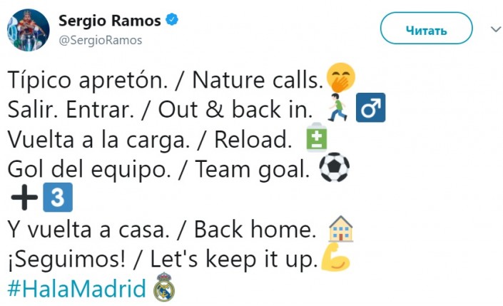Сам Рамос в Twitter также подтвердил случившееся: "Природа зовет. Сходил туда-обратно. Перезарядка. Забили гол. Возвращаемся домой. Так держать".