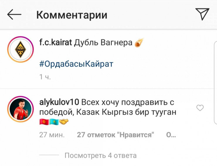 Отреагировал на эпизод и клуб "Кайрат", опубликовав совместное фото Аймбетова и Алыкулова с эмоджи флагов Казахстана и Кыргызстана.