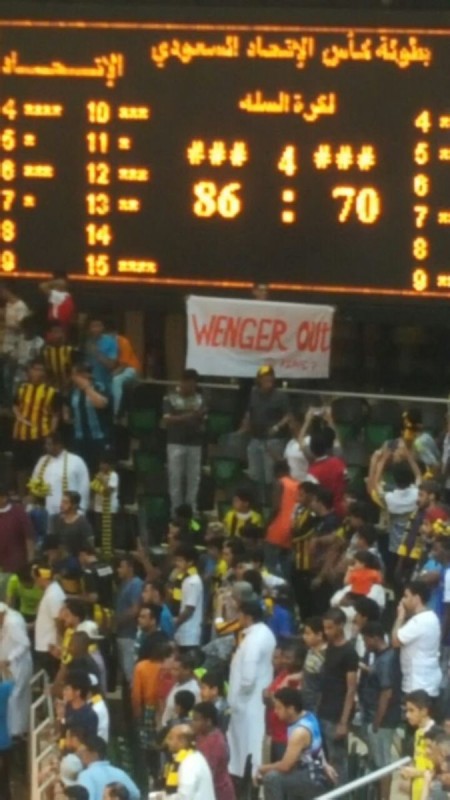 Среди держащих плакат Wenger Out можно заметить известного комментатора Евгения Акманова и ведущего программы "Наш футбол.kz" Петра Воликова.