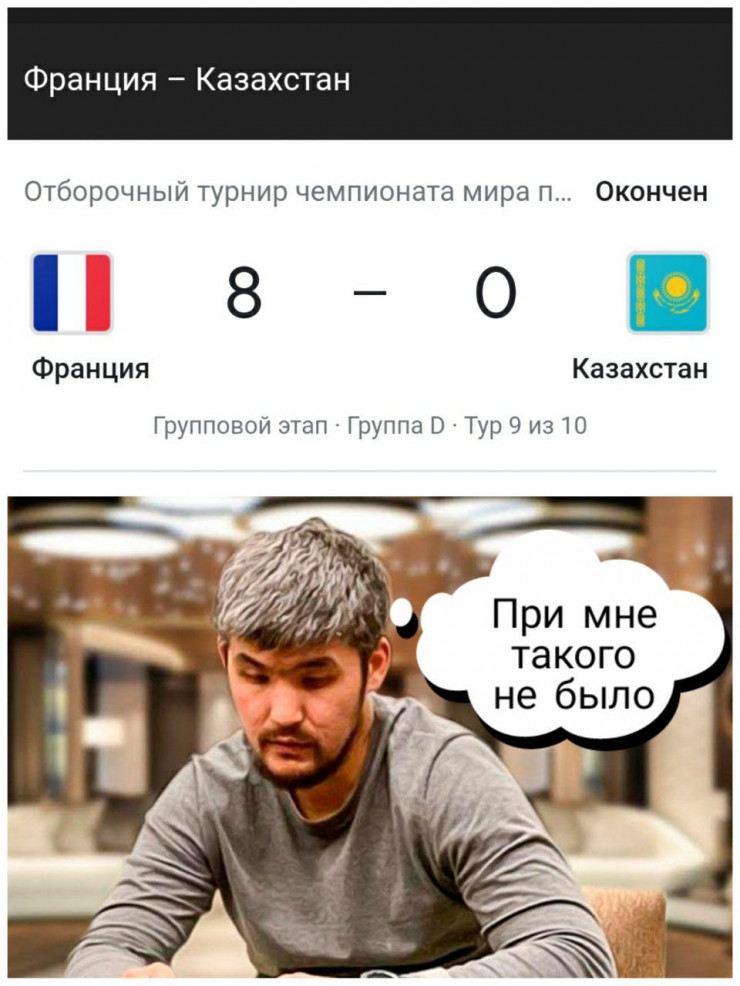 Футболдан Қазақстан құрамасы 2022 жылғы әлем чемпионатының іріктеу кезеңіндегі соңғы матчінде Франциядан 0:8 есебімен жеңіліп, антирекорд орнатқан еді. Қазнет қолданушылары бұл жеңілістен кейін әзілдеуден басқа шарасыз қалып отыр. Желіде Франция - Қазақстан матчінен кейін түрлі әзіл, мем тарады. Tengrinews.kz тілшісі әзілдерді жинап шықты.