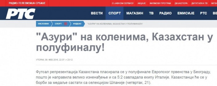 Сайт Радио и телевидения Сербии назвал вылет действующих чемпионов главным сюрпризом турнира. Новость о матче вышла с заголовком: "Адзурри" на коленях, Казахстан в полуфинале!"