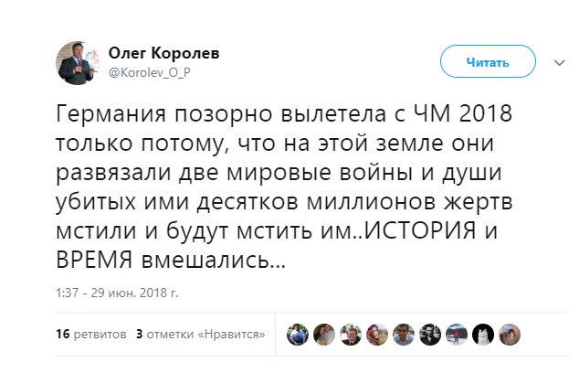 "Кто-то опять мне в Твиттере наляпал... теперь про немцев в футболе. Видно, этот "кто-то" крепко завидует нам из-за продуктивного сотрудничества с Германией (инвестиции, СП и т.д). Дорожим сотрудничеством с ними, как и с другими инвесторами! Так что не ляпайте! Не мешайте! Бесполезно", - оправдался Королев.