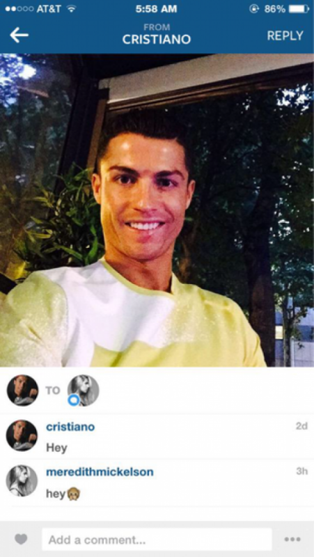 Роналду написал Микельсон в личку в Instagram, прикрепив свою фотографию. После выяснилось, что Мередит всего 16 лет. Игроку "Реала" пришлось прекратить общение с девушкой, в том числе после того, как Мередит заскринила переписку и выложила в Twitter с подписью: "Не знаю, как это произошло, но я не против". Правда, позже пост был удален.