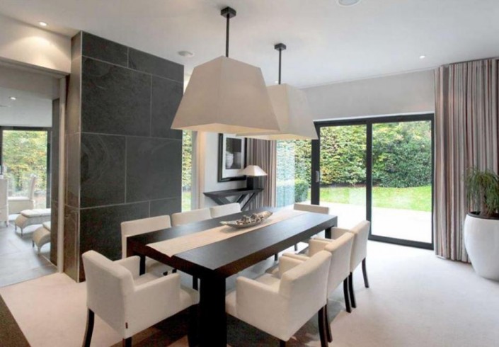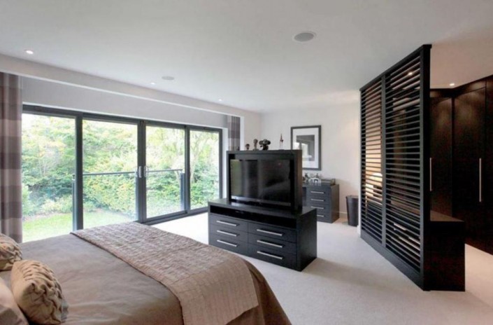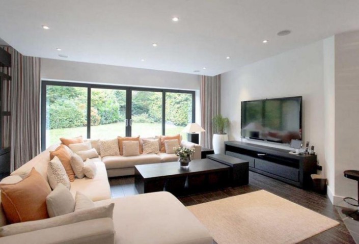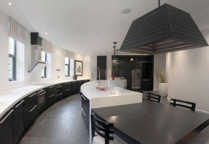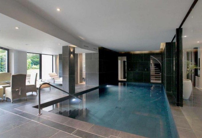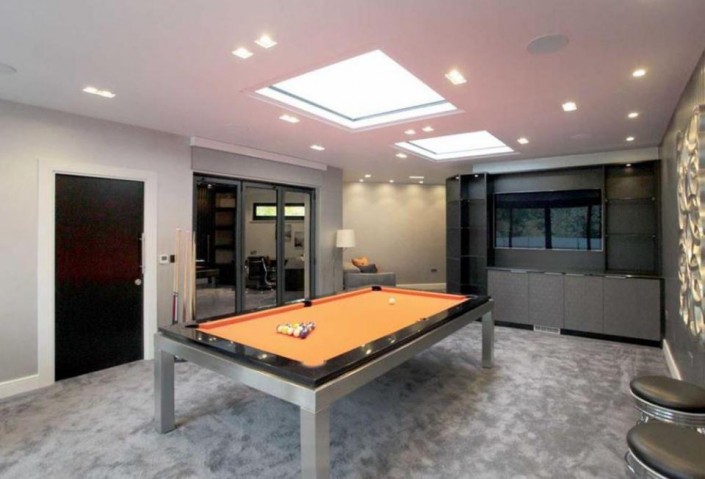 В особняке пять спален, крытый подогреваемый бассейн, отделенный от остальных комнат стеклянной стеной, сауна, бильярдная, медиа-центр, огромная кухня, гараж на две машины и прочие удобства.