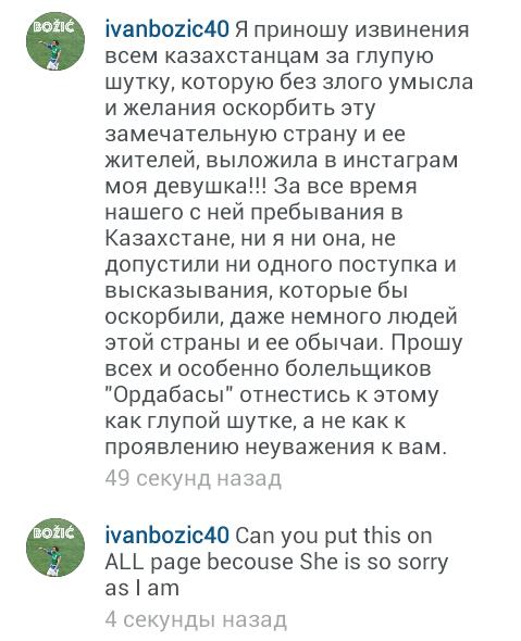 Спустя некоторое время девушка удалила провокационный пост, а сам игрок принес в своем аккаунте извинения всем казахстанцам и болельщикам шымкентского клуба, сообщает Prosportkz.kz. Божич назвал все глупой шуткой.