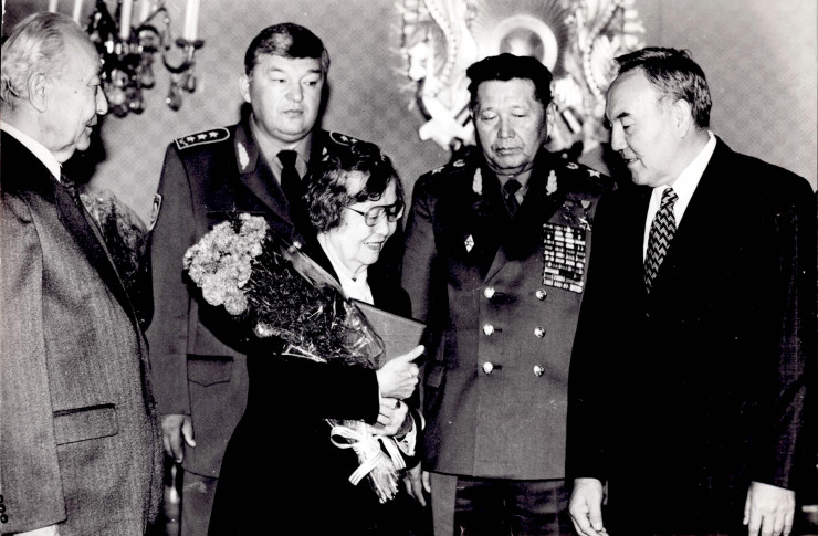 Президент Казахстана Нурсултан Назарбаев вручает награду супруге Рахимжана Кошкарбаева Рахиле Яхиной