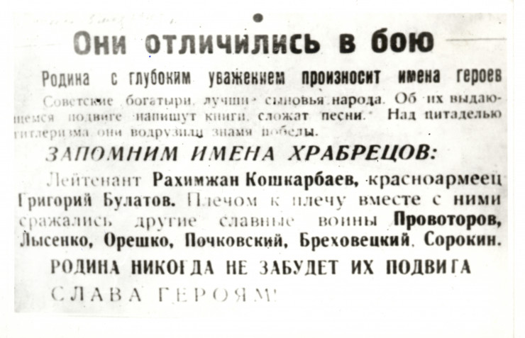 Рахимжан Кошкарбаев уже тогда был известным в Алма-Ате человеком, однако многие его знакомые даже не подозревали, что общаются с воином, установившим знамя победы над Рейхстагом. Стоит отметить, что первый материал о подвиге был напечатан еще 3 мая 1945 года в газете "Воин Родины" - печатном органе дивизии, в которой служил Рахимжан Кошкарбаев. Вся первая полоса была отдана под знаменитый приказ Верховного Главнокомандующего о падении Берлина, капитуляции и пленении 70 тысяч немецких солдат и офицеров. На второй странице в материале неизвестного автора под рубрикой "Они отличились в бою" говорилось: "Советские богатыри, лучшие сыновья народа. Об их выдающемся подвиге напишут книги, сложат песни. Над цитаделью гитлеризма они водрузили Знамя Победы. Запомним имена храбрецов: лейтенант Рахимжан Кошкарбаев, красноармеец Григорий Булатов. Плечом к плечу вместе с ними сражались другие славные воины: Проваторов, Лысенко, Орешко, Пачковский, Бреховецкий, Сорокин".