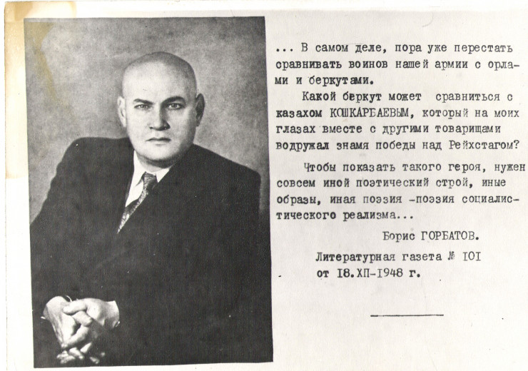 О подвиге молодого война в 1948 году высказывался на пленуме Союза писателей СССР известный советский писатель Борис Горбатов. "В самом деле пора уже перестать сравнивать воинов нашей армии с орлами и беркутами. Какой беркут может сравниться с казахом Кошкарбаевым, который на моих глазах вместе с другими товарищами водружал Знамя Победы над Рейхстагом? Чтобы показать такого героя, нужен совсем иной поэтический строй, иная поэзия..." ("Литературная газета", 18 декабря 1948 года, № 101).