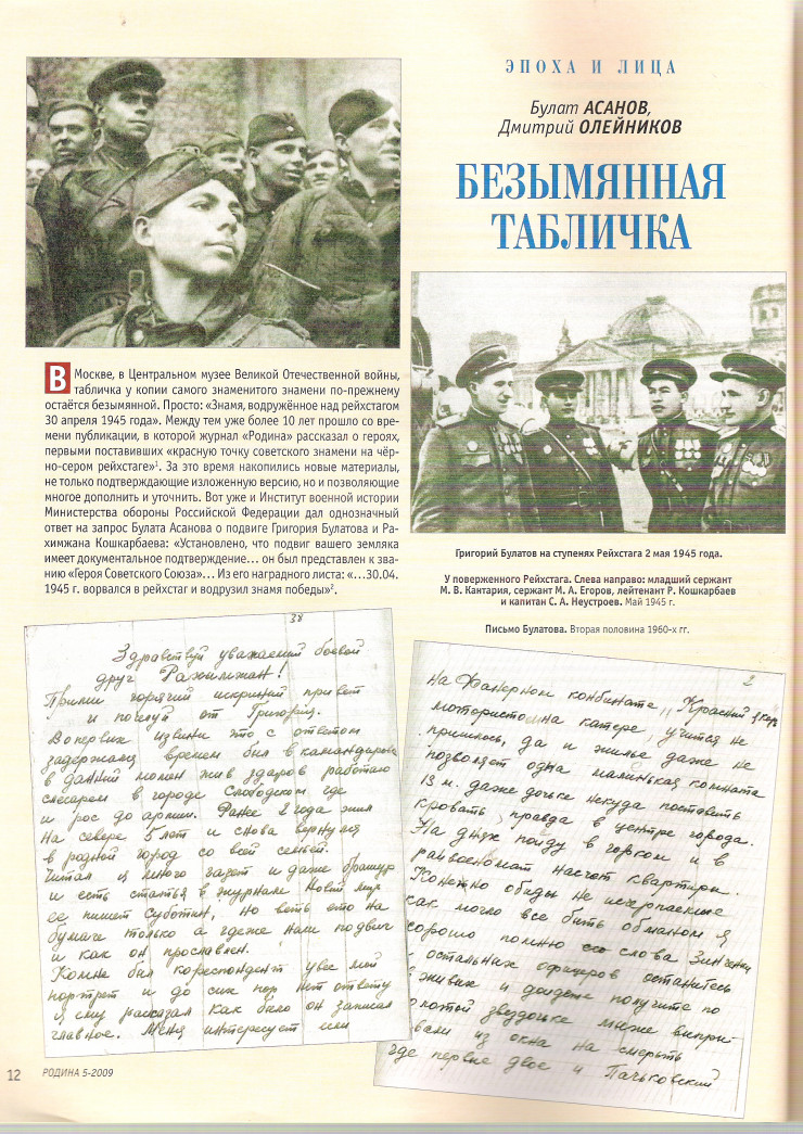 В следующем номере этой газеты от 5 мая под совместным авторством известного военного журналиста В. Субботина и Н. Шатилова вышла статья "Они подняли стяг Победы", в которой событие излагается более подробно: "Кошкарбаев посадил Булатова в окно, сказал: "Ставь, Булатов". Вместе они водрузили алый стяг над Рейхстагом".
