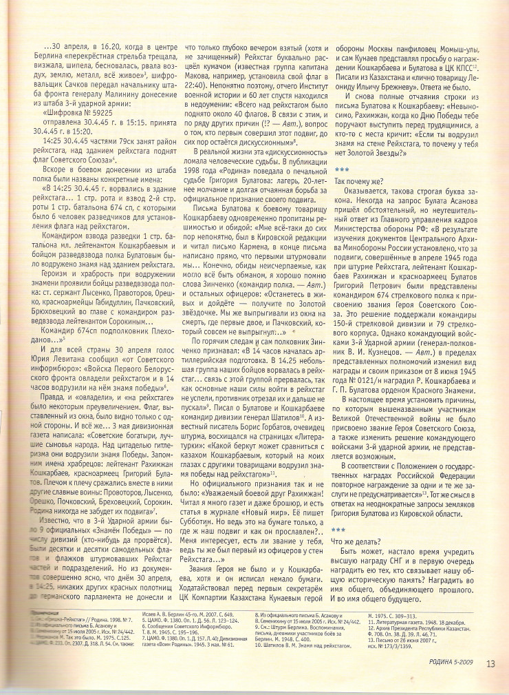 И мы химическим карандашом, который у меня оказался в кармане, тут же, под мостиком лежа, написали: "674 полк, 1 б-н". И вывели свои имена: "Л-т Кошкарбаев, кр-ц Булатов". Мы тут пролежали до темноты. Потом началась артподготовка, и с первыми же выстрелами ее мы подбежали к Рейхстагу. Я поднял Булатова, придерживая его за ноги, и тут, на высоте второго этажа, установили флаг…" По словам Кошкарбаева, 260 метров открытого пространства они вместе с Булатовым ползли более семи часов.