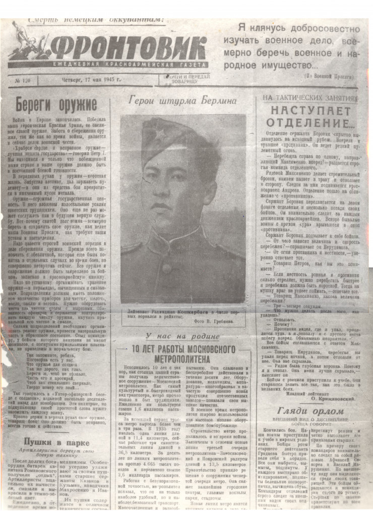 А 17 мая в издаваемой при командовании фронта газете "Фронтовик" под заголовком "Герой штурма Берлина" увидела свет фотография Рахимжана, сделанная фотокором В. Гребневым.