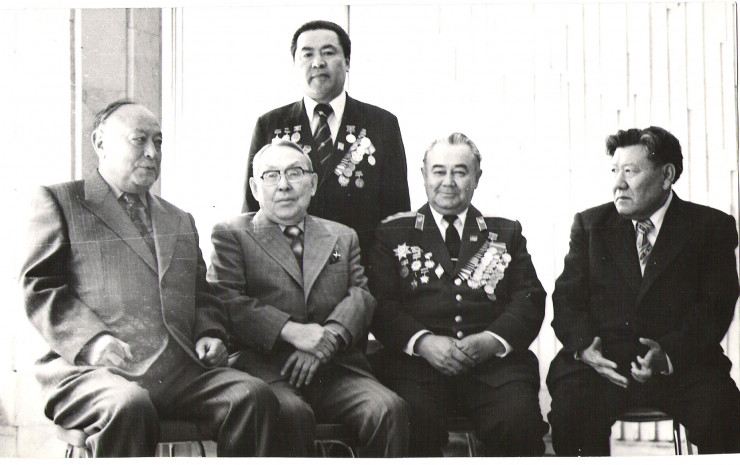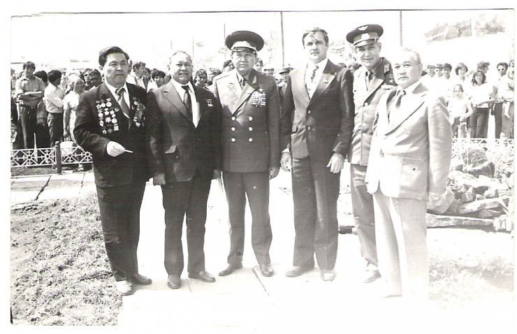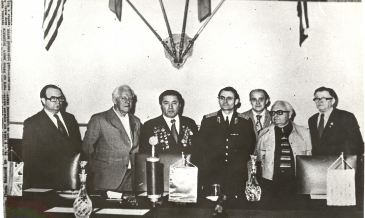 Рахимжан Кошкарбаев, участник штурма Берлина Жанша Жанасов (третий слева) и писатель Сергей Смирнов (третий справа)