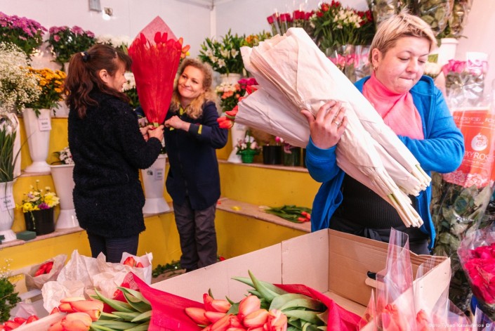 "С первых дней марта начинаем подготовку. Начиная с 6 марта мы работаем круглосуточно, но пик работы, конечно, всегда приходится на 8 марта", - описывают свои будни продавцы цветов.