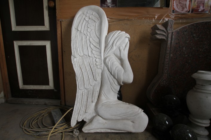 "Скульптура ангел, такие заказывают в основном для детей", - говорит молодой человек по имени Аман. У них с братом в этом районе сразу две мастерские. Одной заведует он.