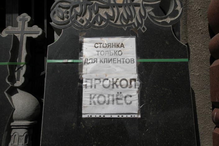 Рядом на светлой могильной плите еще раз, будто уточнение: "Стоянка только для клиентов. Остальным - прокол колес".