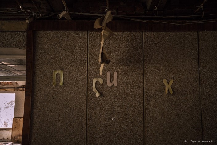 На стене остатки какой-то надписи. Почему-то из всех букв остались только П,С, И, Х. Получилось: "Псих".