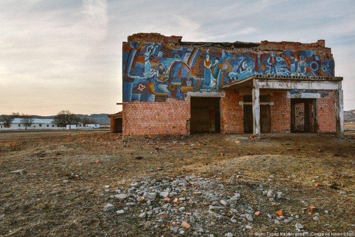 Первое, что можно заметить при въезде в поселок, - полуразрушенное здание сельского клуба, оставшееся с советской эпохи, и вот такой билборд, судя по всему, установленный здесь уже в наше время.