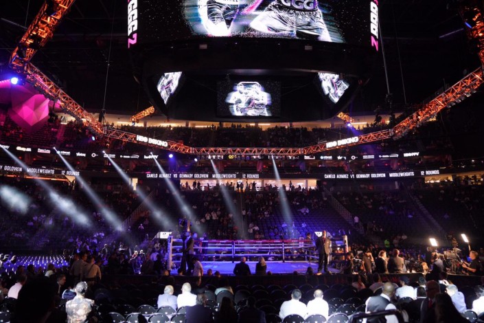 Перед началом главного боя в зале показывают видео о Головкине и Альварасе.