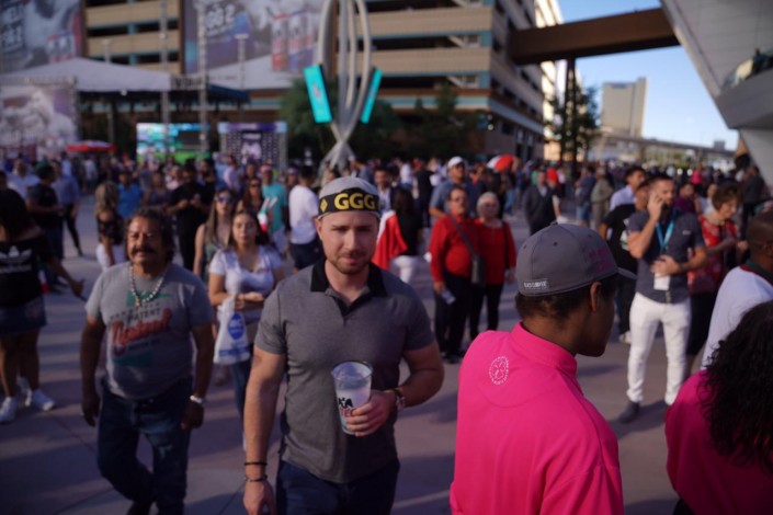 Перед началом боя у арены T-Mobile в Лас-Вегасе собирается множество болельщиков. Повсюду можно было увидеть казахстанский флаг.