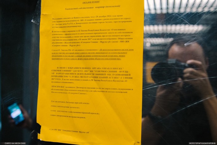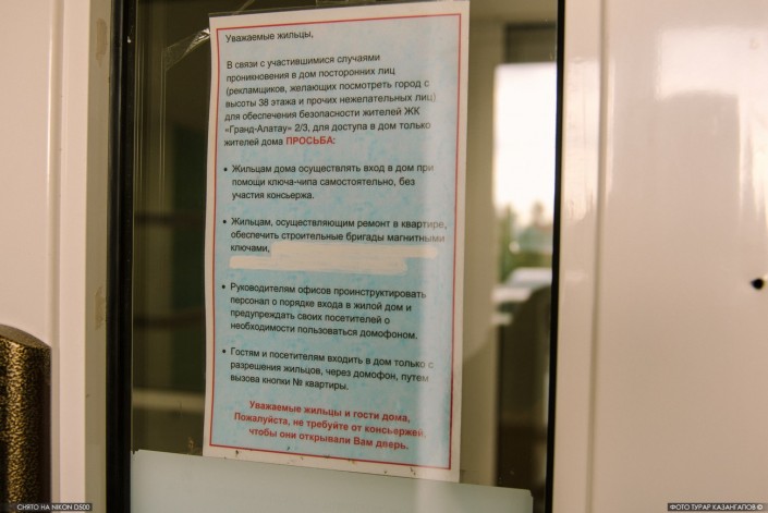 Этот дом расположен в одном из многолюдных мест - на набережной реки Есиль. Чтобы не допустить прохода туда посторонних, местному КСК пришлось расклеить специальное объявление.