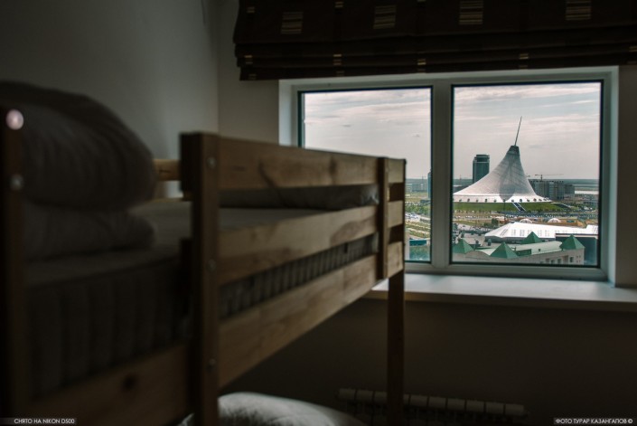 Как рассказал администратор, этот хостел работает недавно и предоставляет широкий спектр услуг. Здесь можно снять на ночь спальное место с видом на Хан-Шатыр за 3500 тенге, а также можно и заселиться сюда на месяц за 45 000.