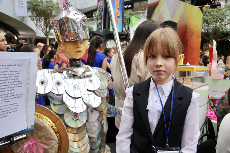 Так, ученица 6-го класса школы № 17 Анастасия Фролова представила своего экобатыра, сделанного из ТБО - пластиковых бутылок, дисков, пакетов и так далее. "Из этого мусора мы сделали такого чудесного батыра. Я верю, что люди перестанут загрязнять наш мир", - заявила Анастасия.