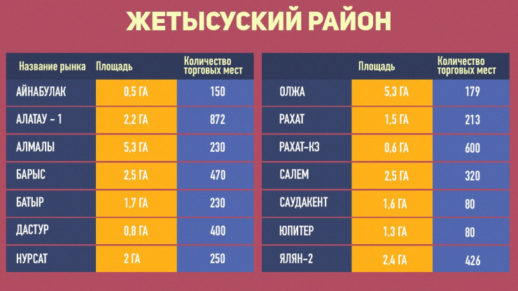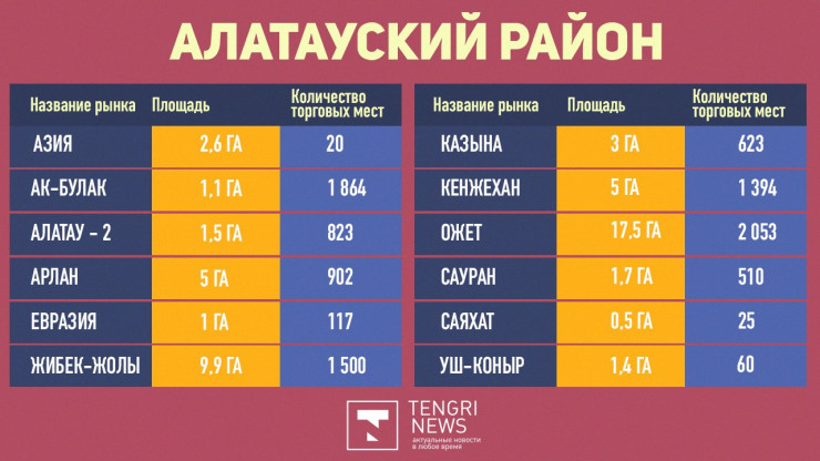 В Турксибском районе расположено 8 рынков, в Алмалинском - 6, Ауэзовском - 4, Наурызбайском - 3, Бостандыкском и Медеуском районах- по 2 рынка.