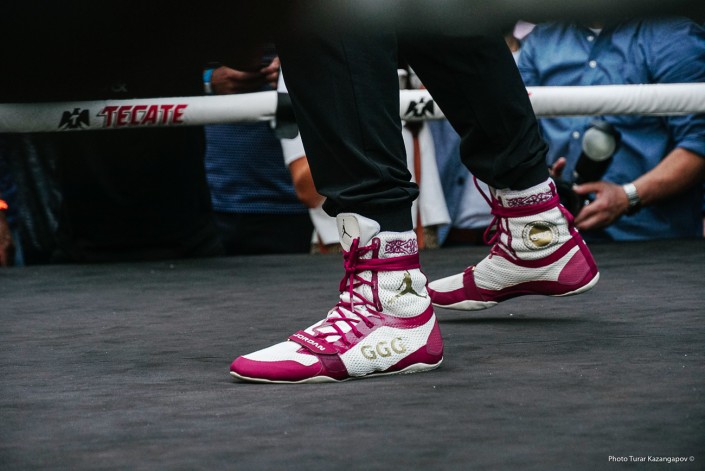 А вот в такой обуви тренируется Геннадий. Специально для боксера знаменитый бренд Jordan готовит вещи с казахскими узорами.