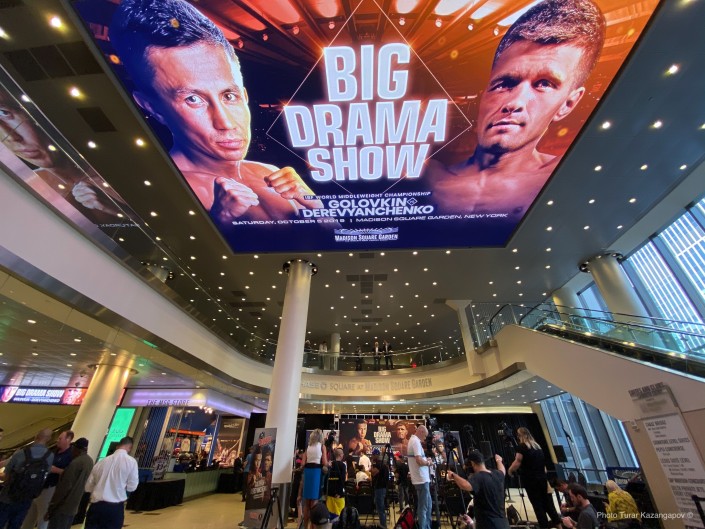На Манхэттене уже давно пестрят афишы и плакаты предстоящего боя. Увидеть изображение Головкина и Деревянченко можно и на многочисленных LED-экранах.