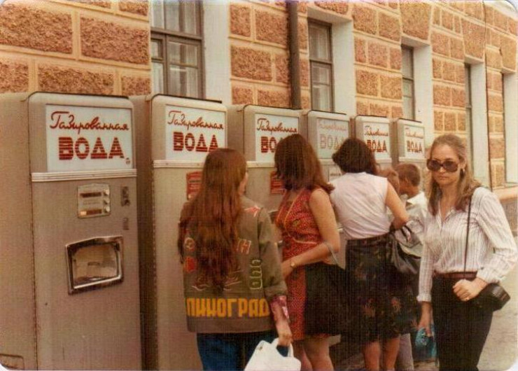 Автоматы с газированной водой. У девушки с длинными волосами на рубашке можно заметить надпись "Целиноград".