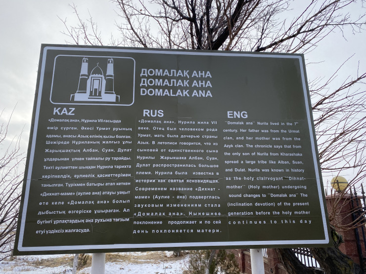 Следующий объект - мавзолей Домалак-ана (Нурила). Родилась она в 1378 году в Туркестане. Нурила была дочерью смотрителя на могиле Ходжи Ахмеда Яссауи - Шайхы Мизамбека. Байдибек би, приехавший в Туркестан, посетил мазар казахского суфия и встретил эту девушку. Его поразили острый ум и учтивые манеры Нурилы. Да и человек с даром ясновидения в мавзолее Яссауи дал ему совет: "Здесь есть девушка, излучающая свет, озаряющая все вокруг, возьмите в жены ее, одаренную святостью и благодатью". Байдибек би внял совету. Вскоре он женился, поставив рядом с двумя еще одну юрту. Нуриле тогда было 19 лет.