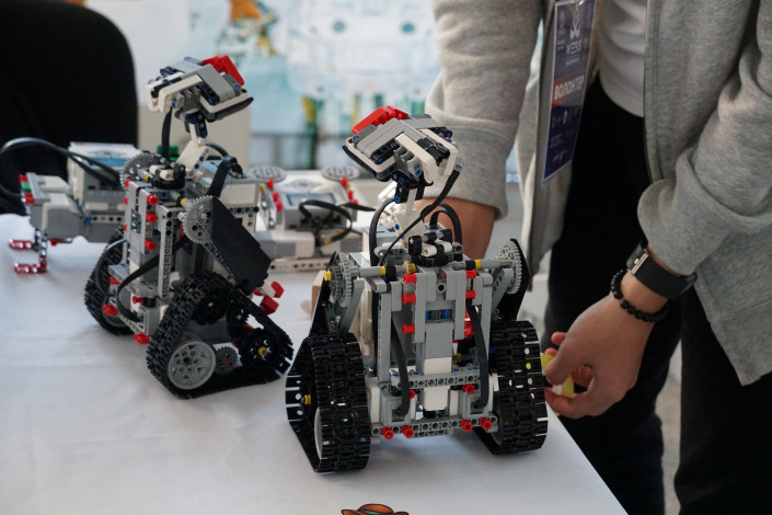 "Мы представляем образовательное направление по робототехнике. Сегодня мы представили "Бои роботов". Суть заключается в том, чтобы роботы выталкивали друг друга. Так выявляется победитель, и "Доставка почты" по лабиринту. Робот Валли несет посылку от старта до финиша", - рассказывает директор клуба робототехники "Лига роботов" Санжар Шалкарбеков.