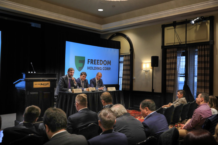 14 октября 2019 года в преддверии открытия торгов на Nasdaq в городе Нью-Йорке состоялась официальная пресс-конференция с участием СЕО Freedom Holding Corp. Тимура Турлова. Журналисты, присутствующие в зале, и те, кто подключился онлайн, смогли задать свои вопросы также президенту Freedom Holding Corp. Аскару Таштитову и финансовому директору холдинга Евгению Леру.